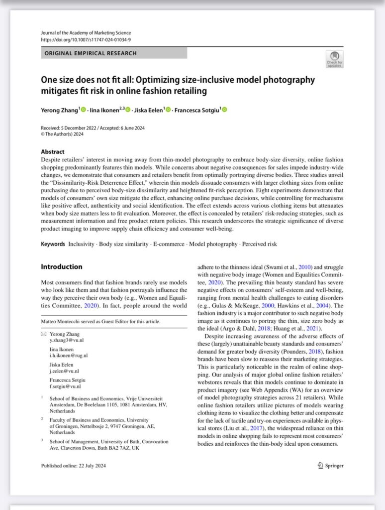 “One size does not fit all: Optimizing size-inclusive model photography mitigates fit risk in online fashion retailing,” Journal of the Academy of Marketing Science, 1-30.